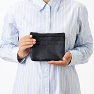 仕分けポケット付きのポリエステル素材フラットタイプ、小さめサイズのポーチです。ポケットが5個ついているので細かく整理することができ、表面はメッシュになっています。