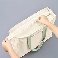 厚手のコットン素材・10オンスのマチありスクエアタイプ、やや大きめサイズのトートバッグです。長いハンドルカラーのアクセントが特徴的なバッグで口元はファスナー付き、内側に大きな内ポケットと外側裏面はスーツケースに固定できるキャリーオン仕様になっています。