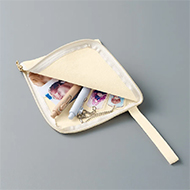 キャンバス素材のマチなしフラットタイプ、小さめサイズのポーチです。ファスナー付きでL字に開くことができるので出し入れがしやすく、ストラップ付きで持ちやすいポーチです。