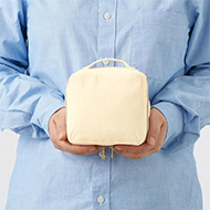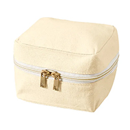 キャンバス素材のマチありボックスタイプ、小さめサイズのポーチです。ファスナー付きで大きく開くことができるので出し入れがしやすく、収納力もある持ち手付きのポーチです。