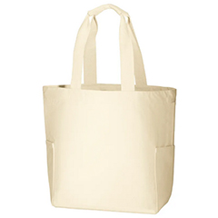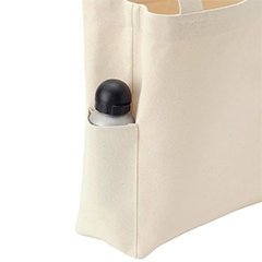 厚手のコットン素材・14オンスの舟形底マチタイプ、大きめサイズのトートバッグです。両側にサイドポケット付きのバッグです。