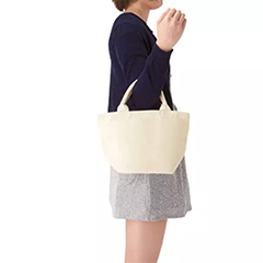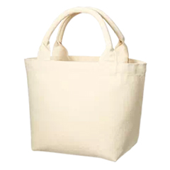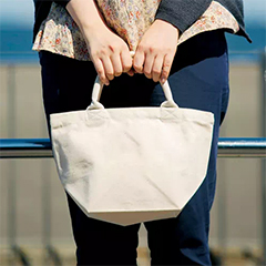 厚手のコットン素材・14オンスの舟形底マチタイプ、ランチバッグサイズのトートバッグです。丸みのあるパイプハンドルが特徴的なバッグです。