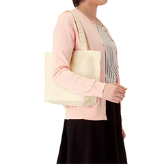 厚手のコットン素材・12オンスの舟形底マチタイプ、少し小さめサイズのトートバッグです。A4が横にちょうど入るサイズ感で、タブレット端末の持ち運びなどにも適しています。