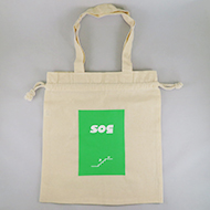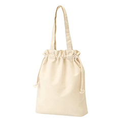 薄手のコットン素材・5オンスの底マチタイプ、小さめサイズのトートバッグです。口を絞れる巾着タイプなので、中身が見えないように使うことができます。