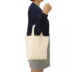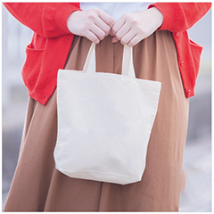 薄手のコットン素材・シーチングの舟形底マチタイプ、小さめサイズのトートバッグです。軽くて小さく折りたたむことも可能。日常のちょっとしたお出かけ時などでの小物入れに便利です。