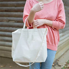 薄手のコットン素材・5オンスの舟形底マチタイプ、スタンダードサイズのトートバッグです。ショルダー仕様とトートバッグ仕様の2WAYで、使いやすい横広のフォルムです。
