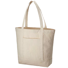 厚手のコットン素材・12オンスの舟形底マチタイプ、大きめサイズのトートバッグです。ハンドルラインと外ポケットが特徴的なバッグです。