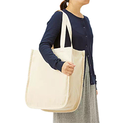 厚手のコットン素材・10オンスの箱型スクエアタイプ、大きめサイズのトートバッグです。バッグ内側の仕切りポケットが特徴的なバッグです。