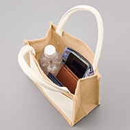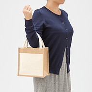 ジュート素材の箱型スクエアタイプ、小さいサイズのトートバッグです。天然素材でナチュラルな印象のバッグに、キャンバス素材の大きなフロントポケットが付きました。細かいデザイン等の名入れもしやすいバッグです。