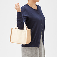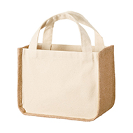ジュート素材とキャンバス素材を組み合わせた箱型スクエアタイプ、小さいサイズのトートバッグです。底角のラウンド形状が特徴的で、キャンバス面に細かいデザイン等の名入れもしやすいバッグです。