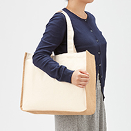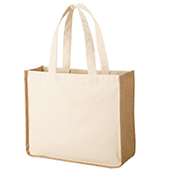 ジュート素材とキャンバス素材を組み合わせた箱型スクエアタイプ、大きめサイズのトートバッグです。底角のラウンド形状が特徴的で、キャンバス面に細かいデザイン等の名入れもしやすいバッグです。