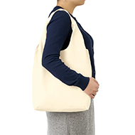 薄手のコットン素材・5オンスの底マチマルシェタイプ、スタンダードサイズのくり手型トートバッグです。使いやすいくデザイン性もある形状で、ハンドルトップは二つ折に縫製されているので肩掛けもしやすいバッグです。