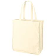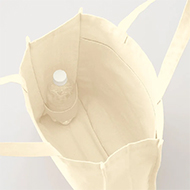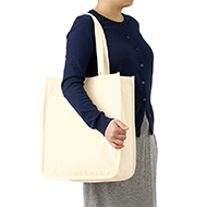 厚手のコットン素材・10オンスのマチありスクエアタイプ、やや大きめサイズのトートバッグです。内側に付いた仕切りポケットが特徴的なバッグで、持ち手の付け根にはキーホルダーをかけられるループも付いています。