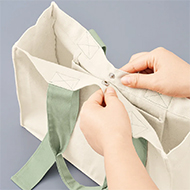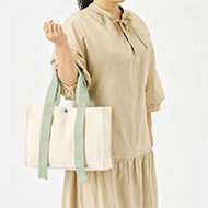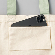 厚手のコットン素材・10オンスのマチありスクエアタイプ、小さめサイズのトートバッグです。長いハンドルカラーのアクセントが特徴的なバッグで口元はホック付き、内側にスマホが入る内ポケットと外側にストラップを掛けられる金具が付いています。