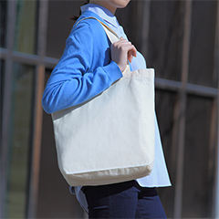 薄手のコットン素材・4.7オンスの舟形底マチタイプ、スタンダードサイズのトートバッグです。一般的なサイズ感でオーソドックスなバッグはあらゆるシーンで活用できます。