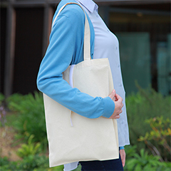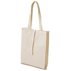 薄手のコットン素材・4.7オンスの折り込み横マチタイプ、スタンダードサイズのトートバッグです。小さくたたんでヒモで留めることができます。