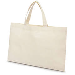 薄手のコットン素材・4.7オンスのマチなしフラットタイプ、大きめサイズのヨコ型トートバッグです。B4サイズが横に入るサイズ感です。
