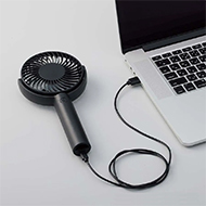 持ち歩きできるハンディファン、充電式タイプです。ハンディで手持ち・卓上でスタンドの2WAY使用ができて風量は3段階調節が可能、ヘッド部分は上下約20度の可動式です。