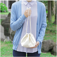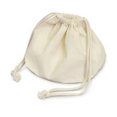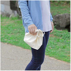 薄手のコットン素材、小さめサイズの巾着です。マチがあるのでお弁当箱なども入る容量があります。