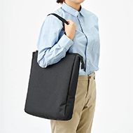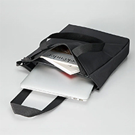 PCを入れて持ち運べるトートバッグです。内側にウレタンが入っていてPCへの負担を軽減できベルクロで止めることができる、バッグの口元にファスナー付のバッグです。対応サイズの目安は13.3インチPC程度です。